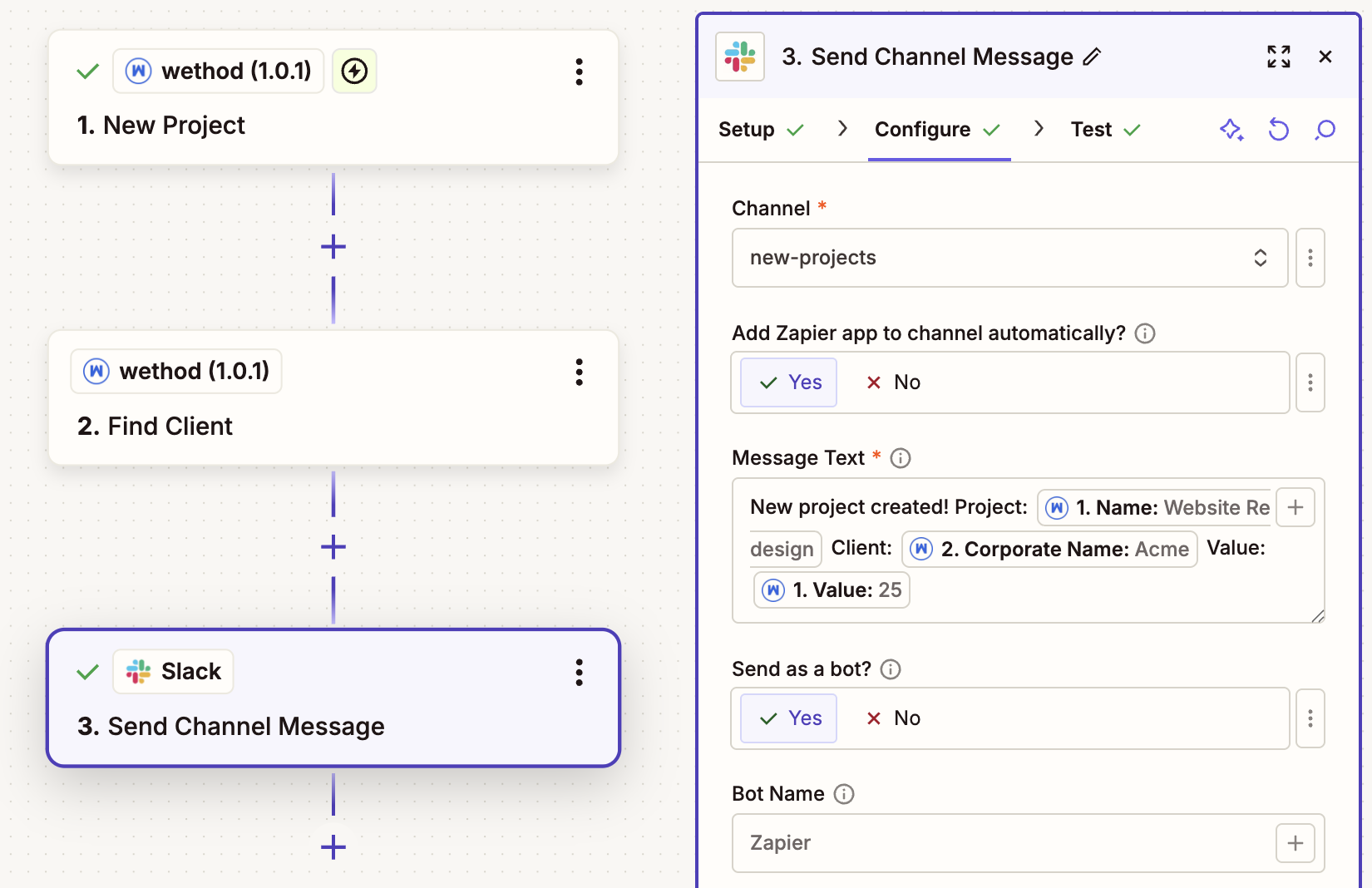 Let's walk through a complete example. We'll create a Zap that sends a Slack message with the project name and client name whenever a new project is created in wethod.