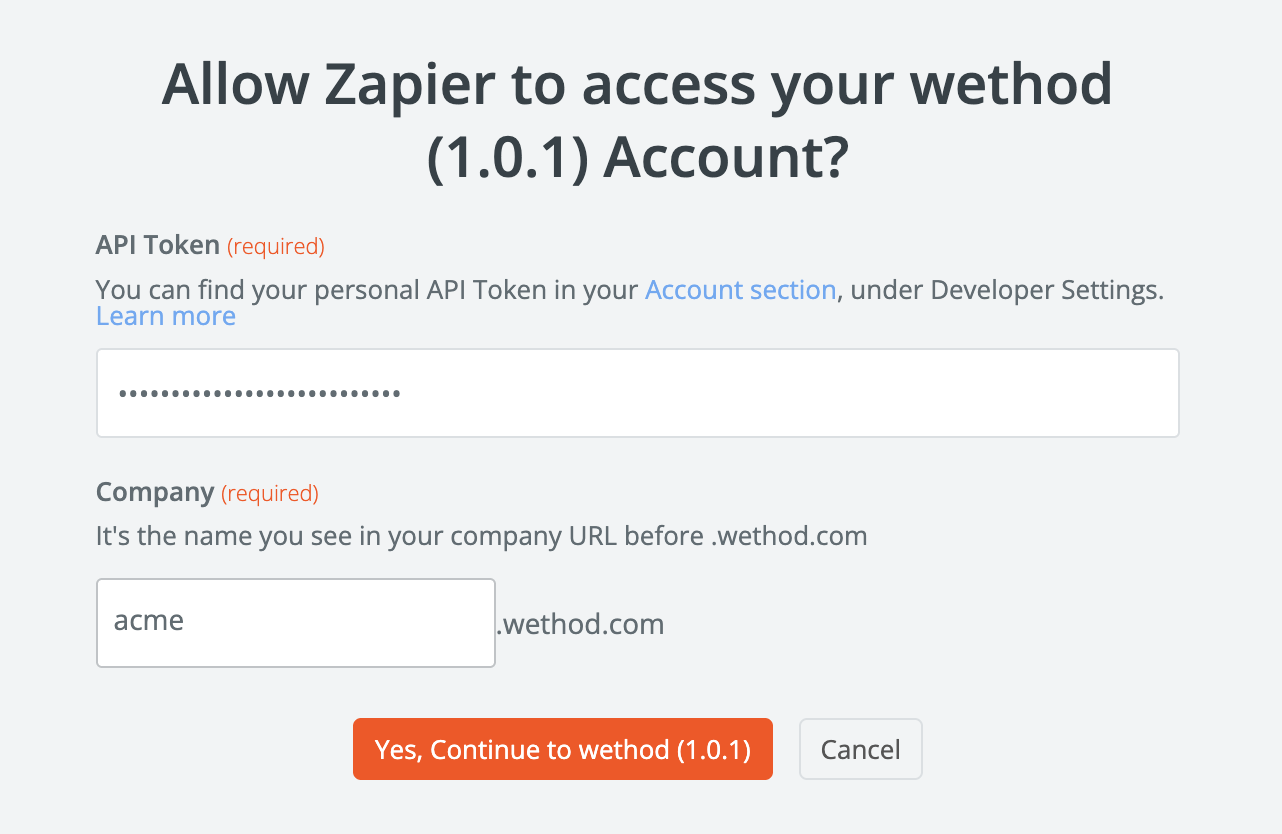 When prompted to connect your wethod account, you will need to provide two pieces of information: