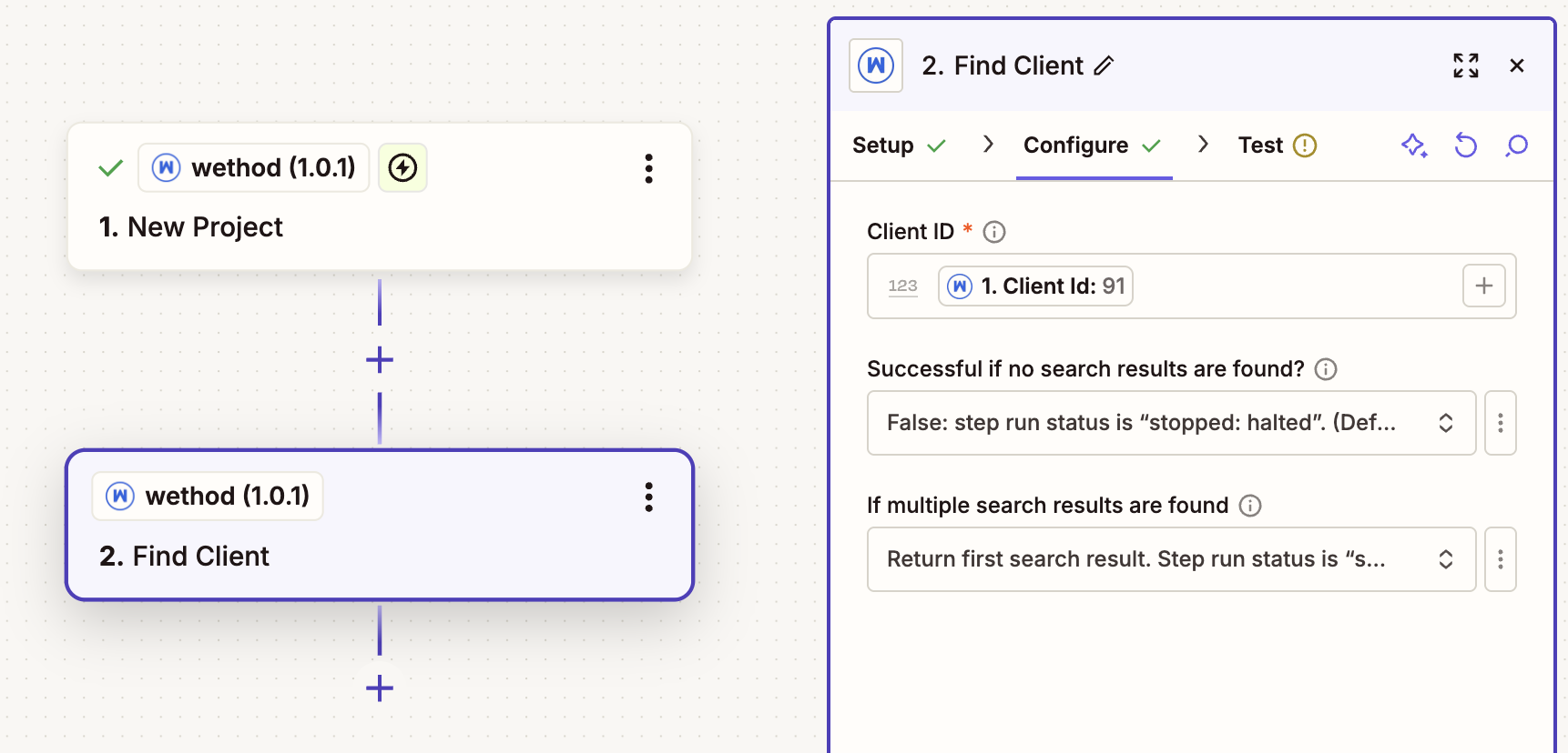 - Test the trigger - Zapier will pull in a sample project from your wethod account.